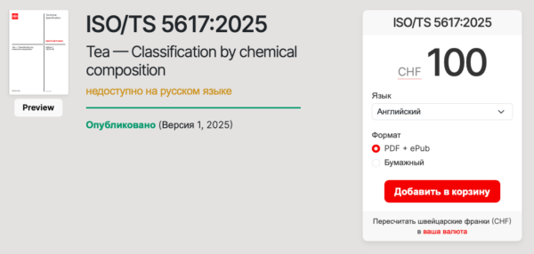 Китайские коллеги похвастались разработкой нового международного чайного стандарта. С номером ISO/TS 5617:2025 и названием Tea — Classification by chemical composition, «Чай — классификация по химическому составу». Этот стандарт, как не сложно догадаться, описывает различия между видами чая, которые можно выявить… Читать далее →